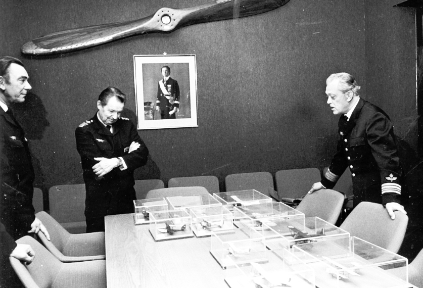 F6 Karlsborg. Flygledare Peterson överlämnar av honom tillverkade och skänkta flygplansmodeller till F6 för att senare ställas ut på Karlsborgs museum. Till vänster: intendenten överstelöjtnant Hornvall, Chefen F6 överste Hovhard. Albumet är en del av en donation från Karl-Axel Hansson, Karlsborg. Förteckning över hela donationen finns i albumet samt som Word-dokument.