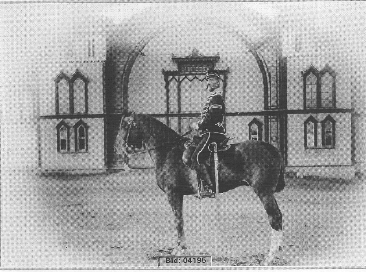 Trestreckad furir (underbefäl) med underofficersutbildning framför Egnellska ridhuset som användes av K 3 fram till K 3 kaserner och stallen var färdiga vid Gärdhem. Egnellska ridhuset låg där Helenaskolan nu ligger.