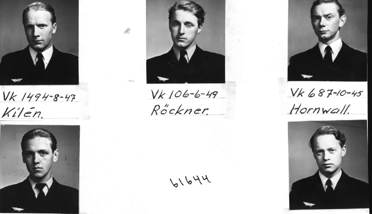 F6 Karlsborg 1948. Delar av 2. divisionens flygstyrka. Överst och från vänster: Vicekorpralerna 1494-8-47 Kilén, 106-6-49 Röckner, 687-10-45 Hornwall, 104-6-49 Nihlstrand, 102-6-49 Johansson. Albumet är en del av en donation från Karl-Axel Hansson, Karlsborg. Förteckning över hela donationen finns i albumet samt som Word-dokument.