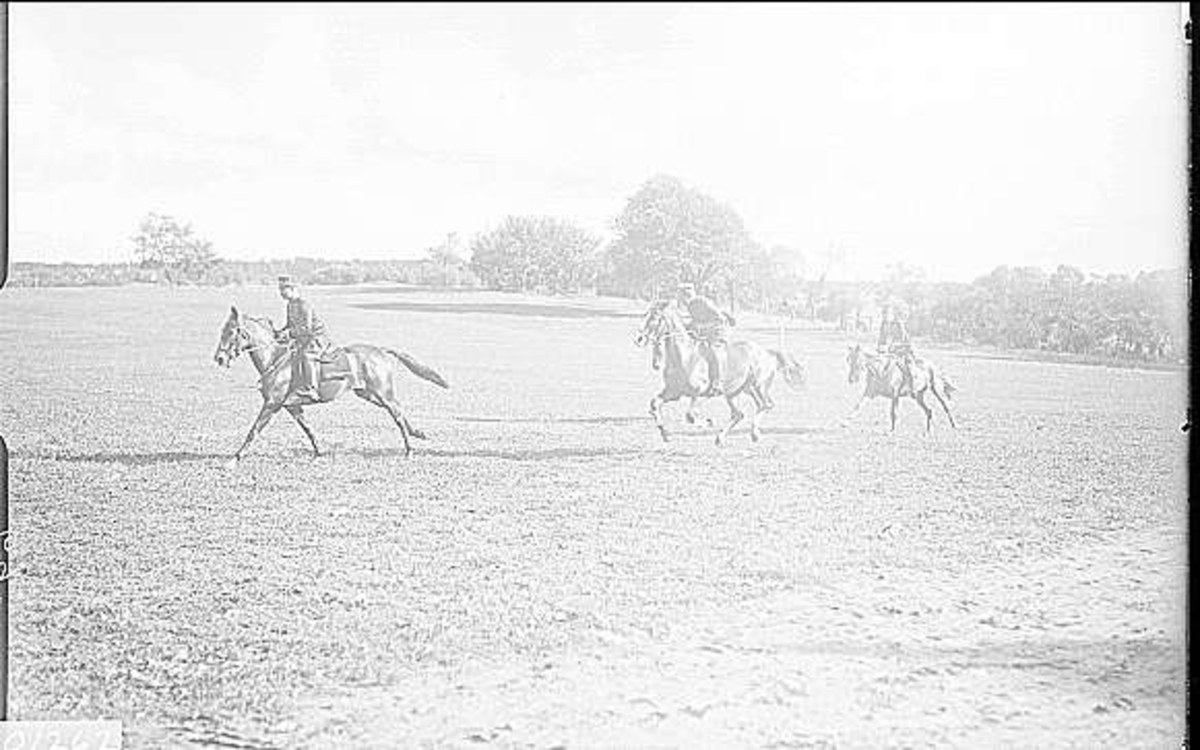 Regementskapplöpningar på övningsfältet söder K 3 kasern. Kapplöpningsbanans sydvästra sträckning ner mot trumslagargropen öster I 9 (P4) kasernområde. Från steeplechace för off. I täten A. Ekman (mycket framstående kappl. ryttare) i kön löjtn. Lars af Sillén.