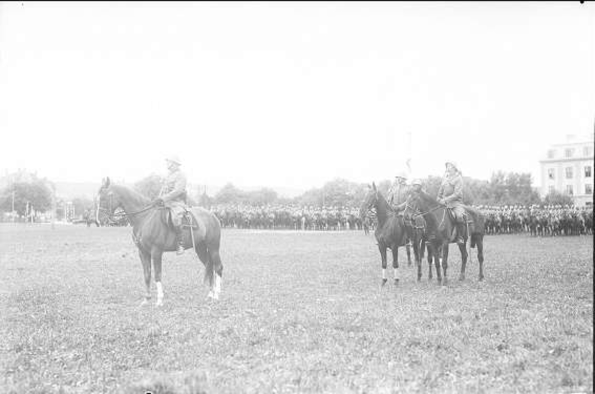 Sekunchefen åtföljd av stabschef och adjutant framför regementets front på fältet söder om K 3 kasern.
