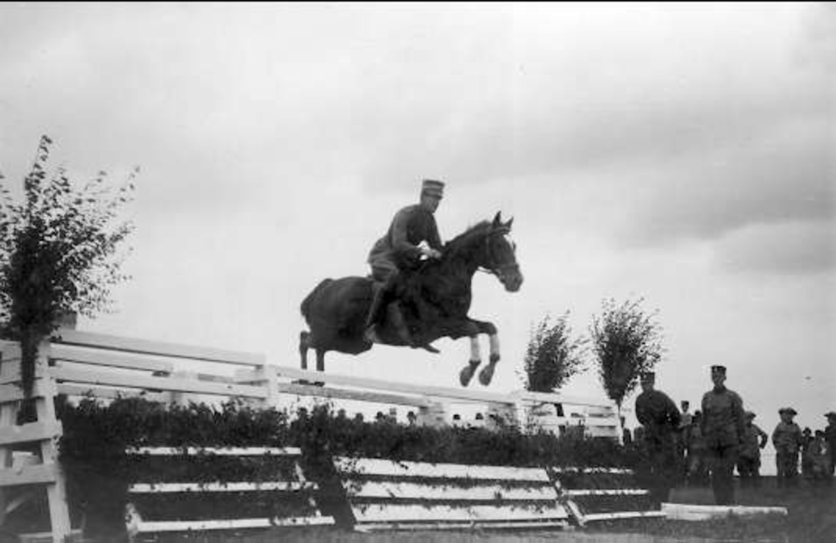 Löjtnant Carl Otto (Cacko) Palmstierna, född 1903, underlöjtn 1925, löjtnant 1929. LHOS prishoppning på södra fältet (Sandfältet). Här på tjänstehästen "Sam" efter Solid**- Reform.