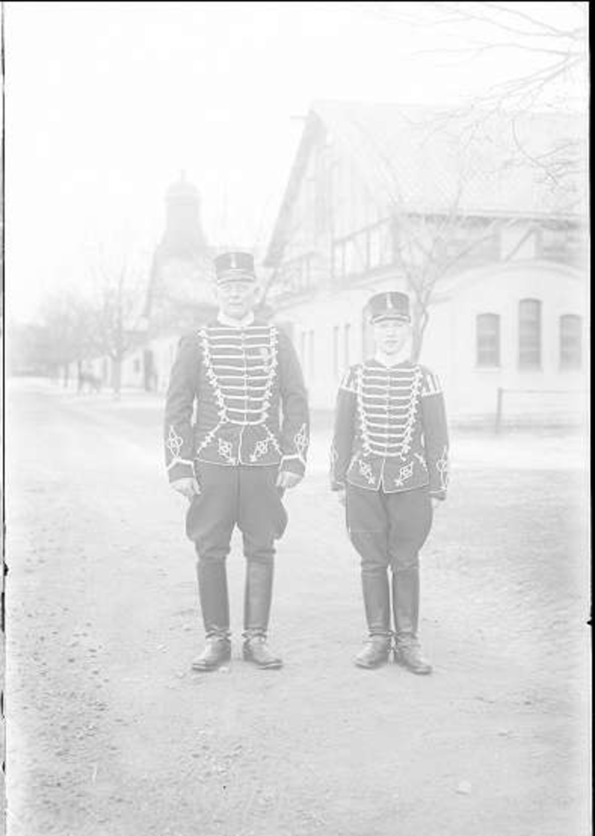 Titel: Indelte husaren nr 41 Wahlstedt tillsammans med "spelet" - ung musikvolontär. Obs! Musikkårens kännetecken "svalboet" på axlarna.