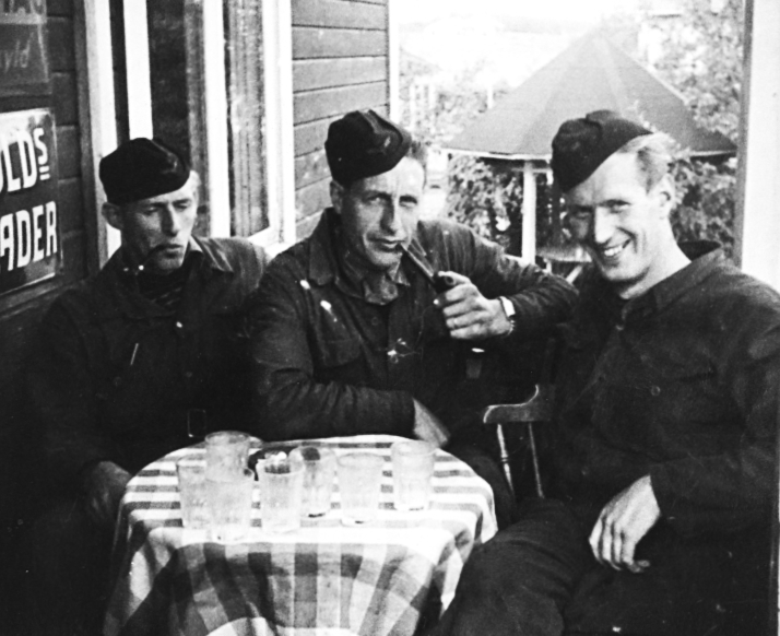 F6 Karlsborg 1944. Delar ur 1. divisionens verkstadstropp .Från vänster: Motormontör Ernbro, radiomontör Svensson, flygplanmontör Lindgren. Albumet är en del av en donation från Karl-Axel Hansson, Karlsborg. Förteckning över hela donationen finns i albumet samt som Word-dokument.