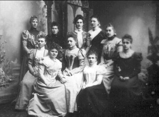 Officersfruar i fotoateljé. Elin Lindstrand, Anna Sandelin/Palmqvist, Elin Falk, Hjortzberg, Maj Ahlman, Signe Ericsson, Mary Olsson, Bergelin, Hagman. Neg finns.