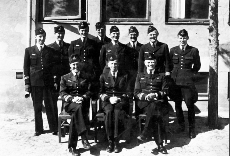 F6 Karlsborg 1946. Sittande från vänster: Chefen Bomb- och Skjutskolan Major Hugosson (Tidigare regementsofficer på F6), exp. officer kapten Engström, lärare kapten Ekdahl. Stående feån vänster: Löjtnant Simmons F14, löjtnant Lindahl F6, löjtnant Rinde F12, Kapten Knutsson E1 stab, löjtnant Lange F17. (Löjtnant Sundqvist Fc ej med på bild). Albumet är en del av en donation från Karl-Axel Hansson, Karlsborg. Förteckning över hela donationen finns i albumet samt som Word-dokument.