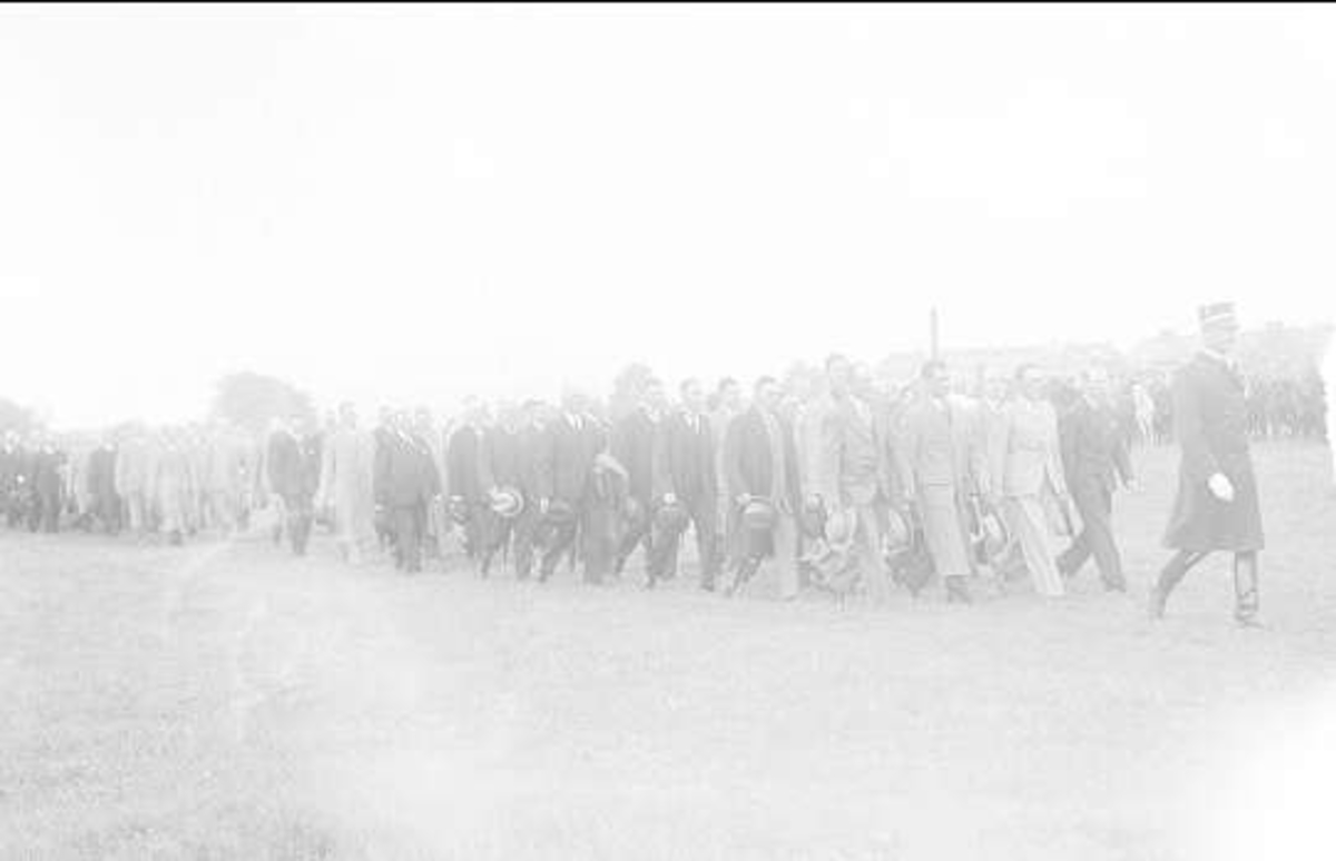 Deltagarna i kamratdagen 7 juni 1937 marscherar ut till uppställningsplatsen på fältet söder om kasern för att lämna av till sekundchefen. I bakgrunden den beridna musikkåren med vit pukhäst.