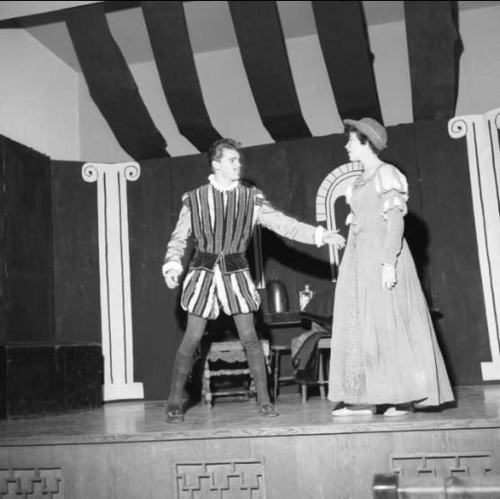Karlsborg. Fotografier från teateruppsättningen av "Så tuktas en argbigga", 1958. Endast neg finns.