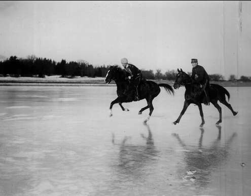 Isgalopp - ett bra sätt att träna hästarna, ty isen är mjuk och sviktande. Strömsholm 1910-11.