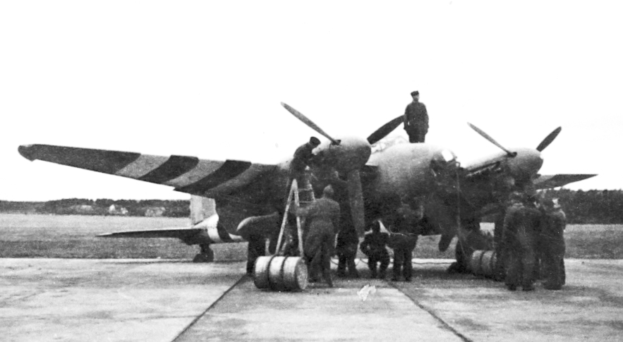 F6 Karlsborg 1944. Engelsks Mosquitoplanet "Trinidad Music" Fick den 15 november mellanlanda på F6-fältet. På vingen och på kroppens bakdel ses D-dagsmärket(invasionsdagen) målade. Flygplanet saknar här de 2 extratankarna som var monterade på vingens undersida. Albumet är en del av en donation från Karl-Axel Hansson, Karlsborg. Förteckning över hela donationen finns i albumet samt som Word-dokument.