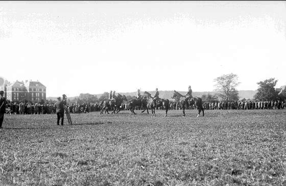 Regementet, dels till häst dels till fots, uppställt söder kasern för korum vid kamratföreningens besök 1931. Fotografering av K 3:s ständiga fotograf Arthur Nilsson.