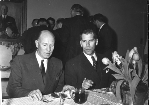 F6 Karlsborg 1953. Sammankomst på regementsofficersmässen. Förre F6-chefen överste Hård till vänster, samt chefen F6 överste Söderlind. Albumet är en del av en donation från Karl-Axel Hansson, Karlsborg. Förteckning över hela donationen, finns i albumet samt som Word-dokument.