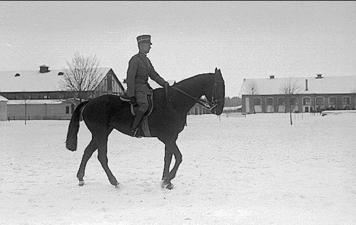 Ryttmästare Rolf Örn med en av sina duktiga prishoppningshästar på kaserngården med ridhuset i bakgrunden. Rolf Örn var en av K 3:s absolut skickligaste prishoppare.