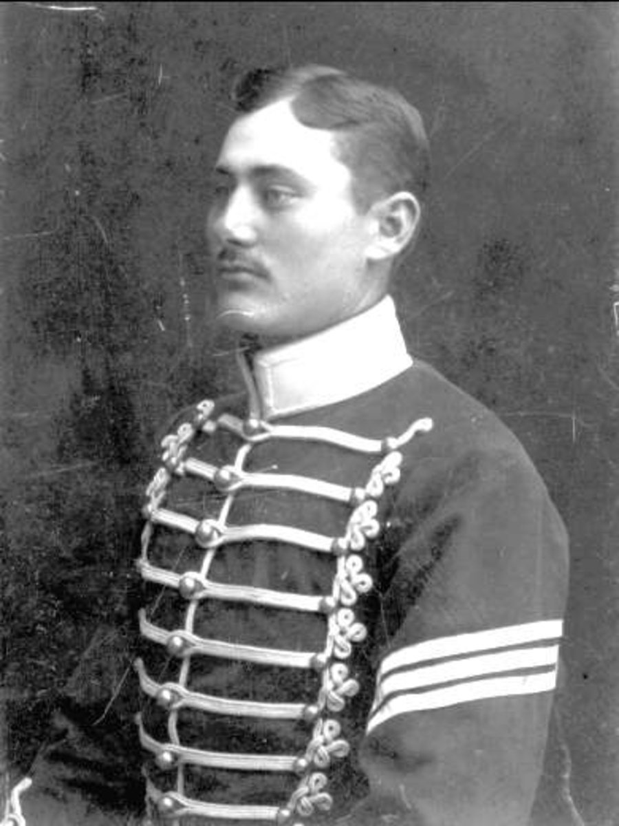 Porträttfoto föreställande Arvid Kjellander (f 1882 01 25, d 1976 02 19) halvprofil. Klädd i husaruniform, underofficerstecken på vänster ärm. Fotot är troligen tagit 1902 då A K gick på skola i Stockholm. Uppgifter enligt dottern Inga Kjellander. Bilden tagen hos fotograffirma, Sigge Öijer, Eskilstuna, filialer i Malmköping och Sanna Hed.