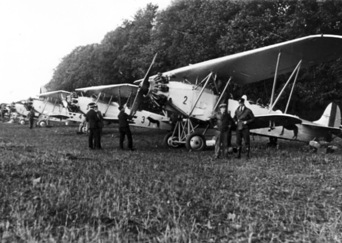 1935. Manöver i Skåne. En varg på flygkroppen symboliserade vän, en röd räv fiende.