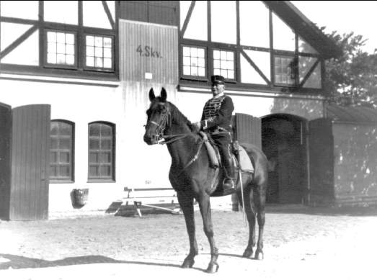 Kopral nr: 33 ÖBS Johan Albert Wahlstedt, född 1866. Skriven till husar 7/9 1889 efter sin far, som tjänat för samma rusthåll. Avsked 30/9 1937. Död i Glanshammar 19/9 1949. Fotot tagit 27/9 1937, under Wahlstedts sista tjänstgöring i samband med avsked. Wahlstedt var regementets siste tjänstgörande indelte husar. Sista rusthållshäst, sto, brun med stjärna och snopp. Född 1897, mankh.153 cm. Antagen 22/10 1901, kasserad 10/10 1914. E. Rameses**. Benämt Julia.