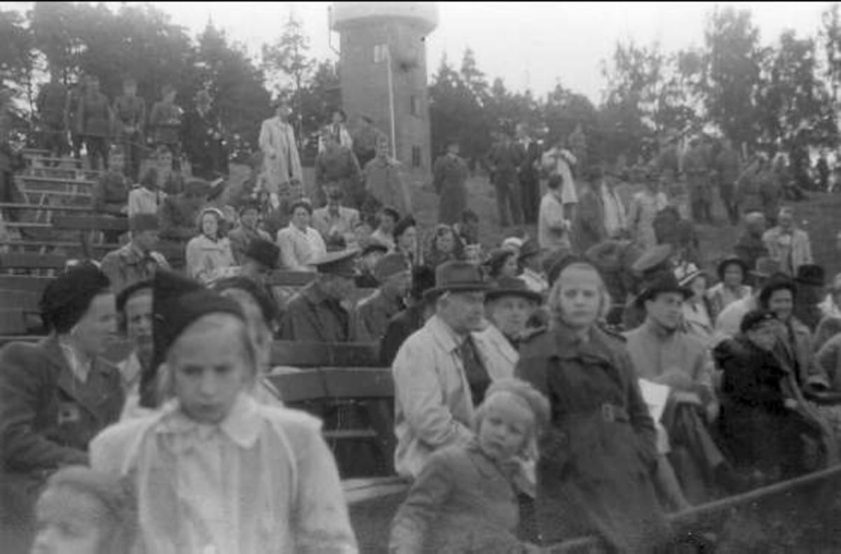 Titel: Åskådare vid SFK:s tävlingar 1947 i prishoppning på prishoppningsbanan öster K 3 kasern.