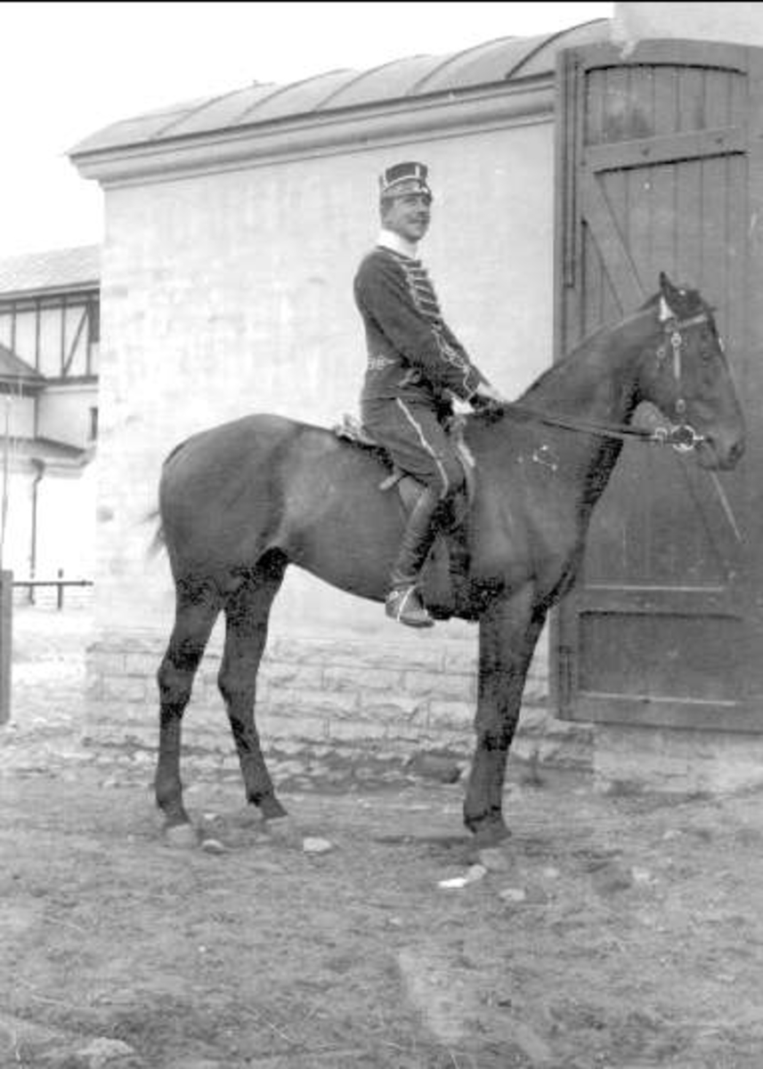 Harry Hedenstierna på hästen Wet Day xx. Fänrik K 3 1905, ryttmästare K 3 1920, efter pension slottsfogde på Gripsholm.