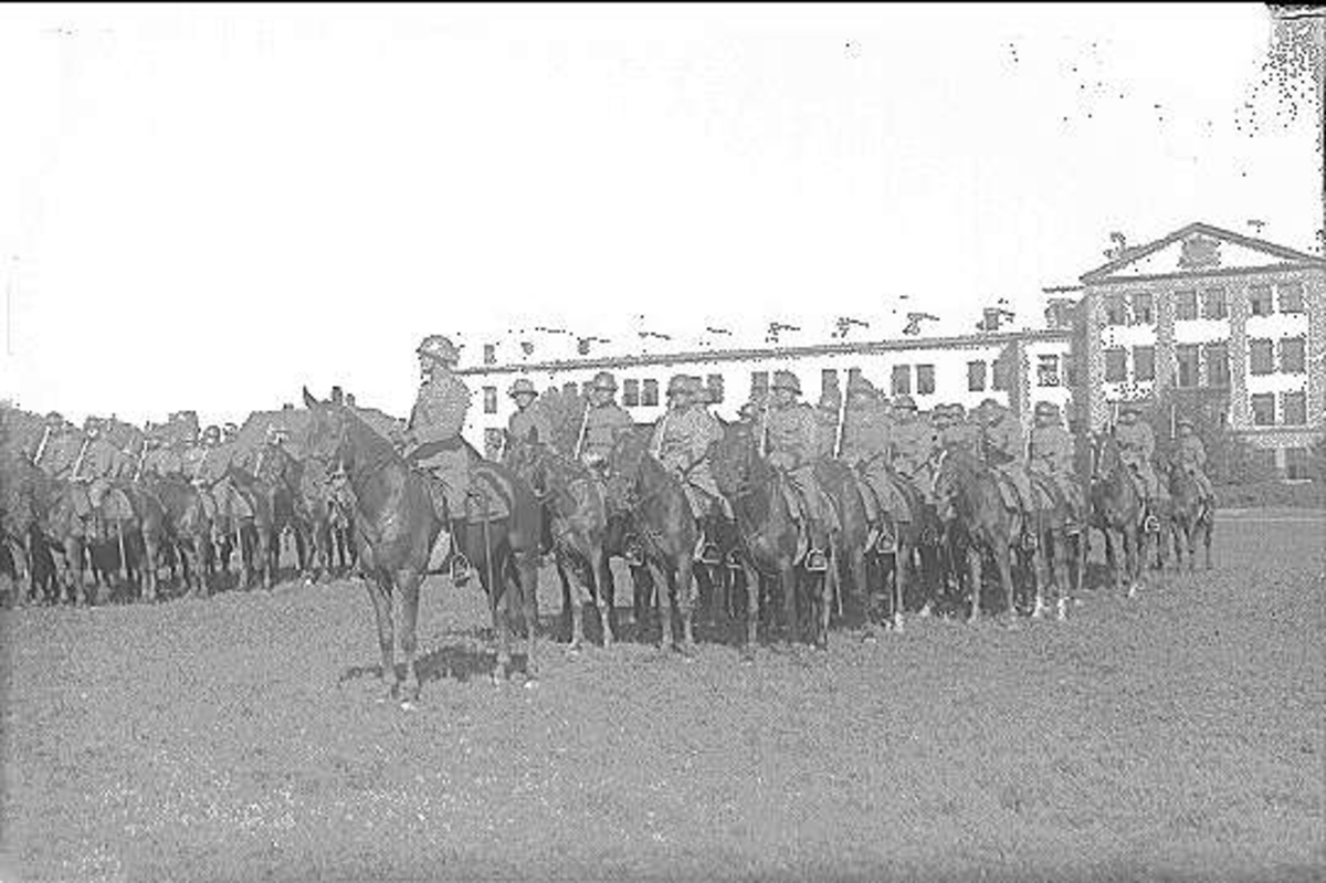 Regementet till häst uppställt på fältet söder om kasern för avlämning före avmarsch för tjänstövning.