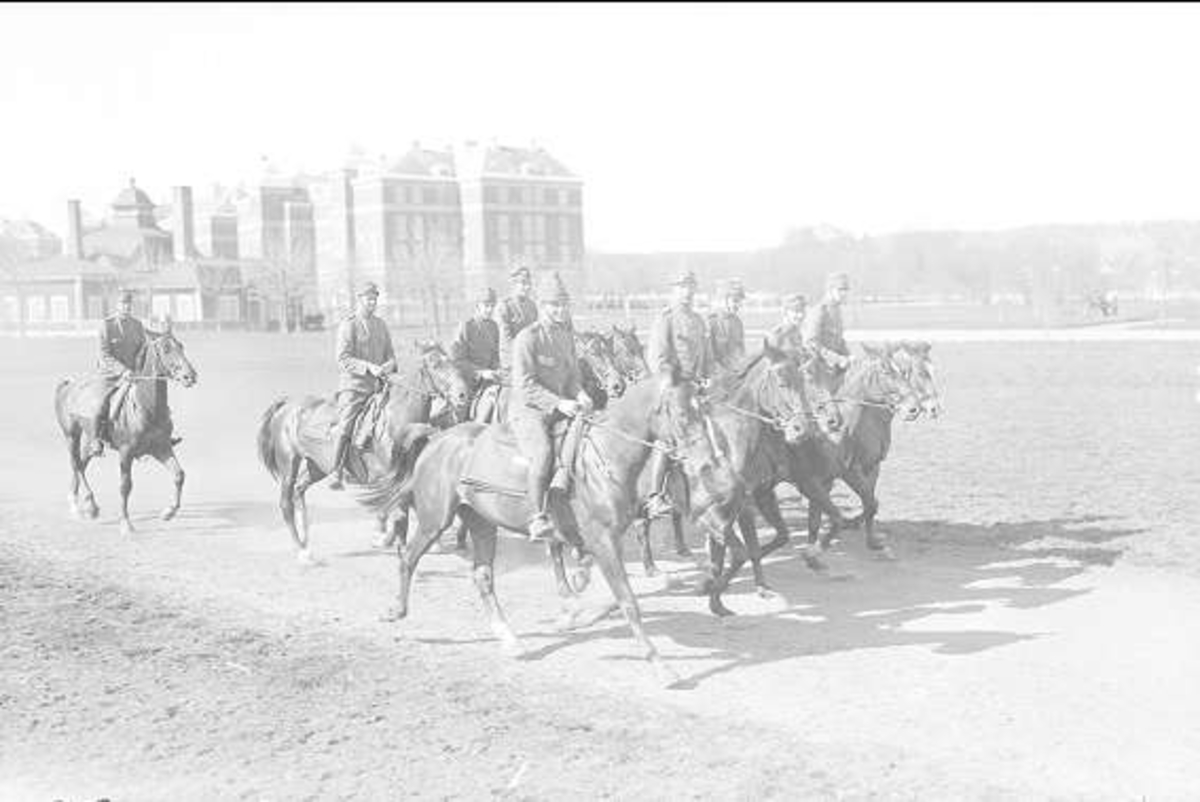 På väg hem mot K 3 kasern. I bakgrunden I 9 (P 4) kasern. Uniform m/23.