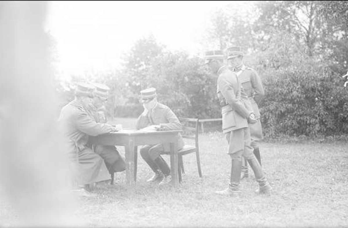 Sammanfattning av kritik efter övning. Från vänster: övlt. Henry Peyron K 3, general Göran Gyllenstierna kavalleriinspektör, övlt. Åke Hök stabsch. Kavalleriinspektionen, ryttm. Harald Strömfelt K 3 (skolchef) och löjtn. Stig Roempke K 3.