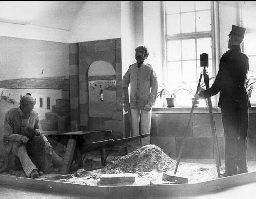 Titel: Karlsborgs museum, fästningshörnan (fångar i arbete). Bakgrunden målad av Carl Tengelin. Foto: Johansson Filmdet. S 2.