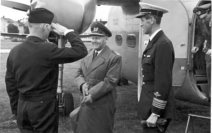 F6 Karlsborg 1958. Chefen västtyska flygvapnet generallöjtnant J. Kammhuber m. flera anländer till F6 i en Pennbroke där general Bjuggren tar emot gästerna.