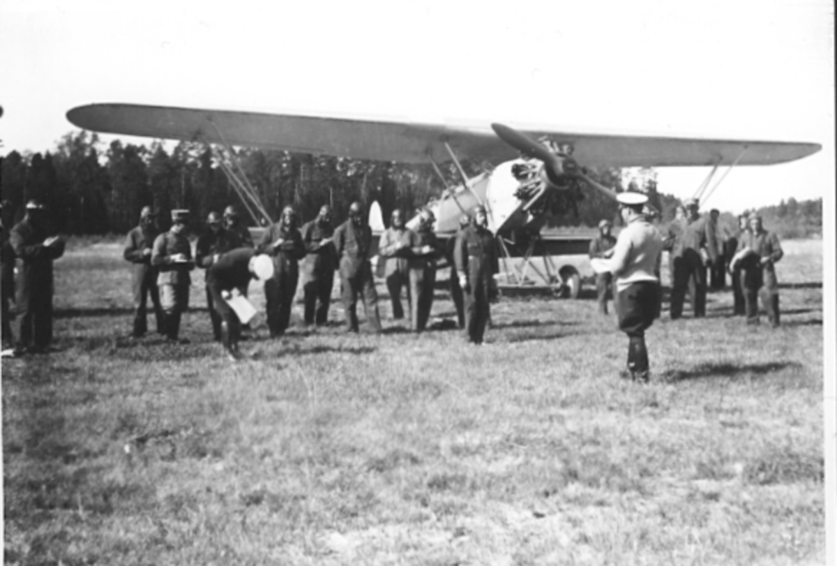 Karlsborg 1932. Kapten John Stenbeck har ordergivning före flygning. I bakgrunden S6 Fokker.