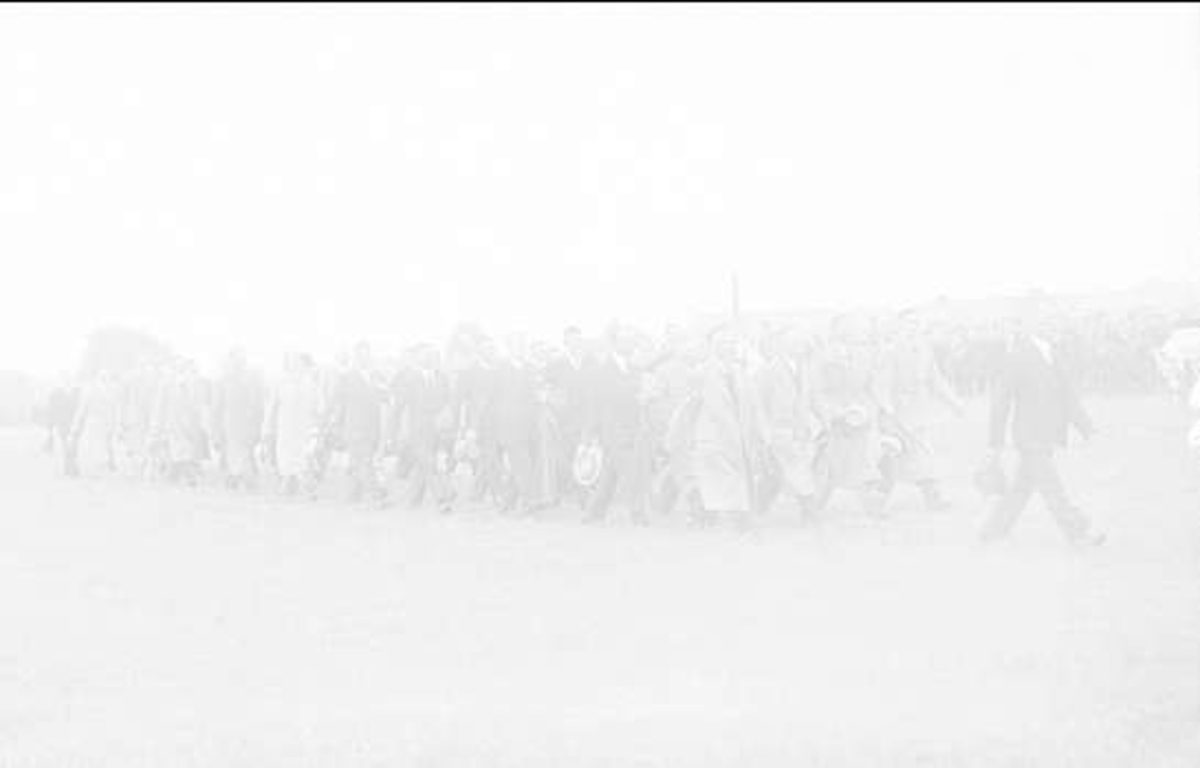 Deltagarna i kamratdagen 7 juni 1937 marscherar ut till uppställningsplatsen på fältet söder om kasern för att lämna av till sekundchefen. I bakgrunden den beridna musikkåren med vit pukhäst.