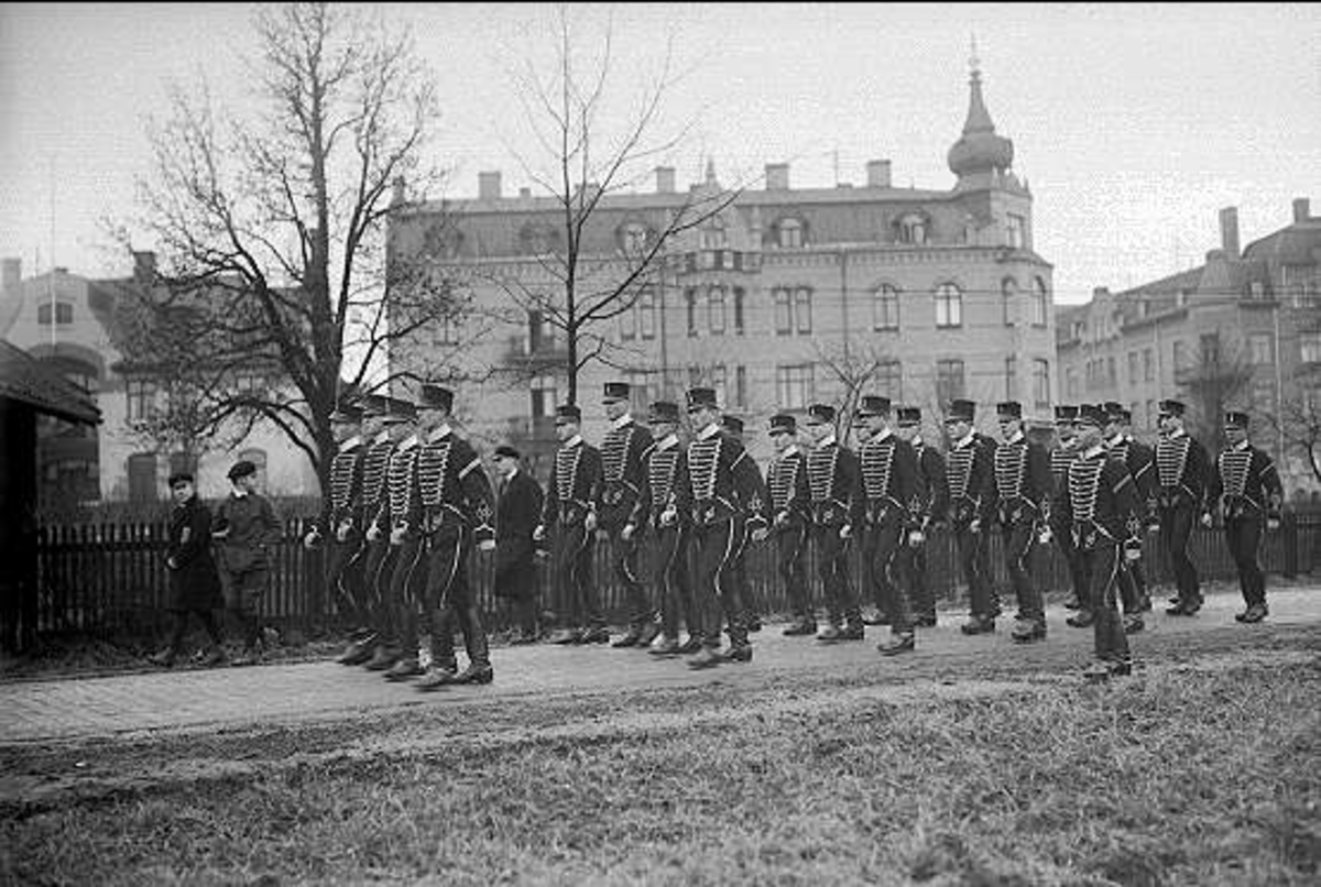 Marsch till soldathemmet för högtidlighållande av 4 december. Täten på 4:e skvadron.