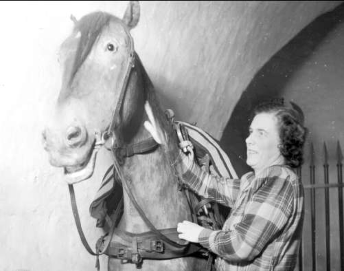 Fröken Annie Persson med "Ester", museéts trogna artillerihäst från 1880-talet.