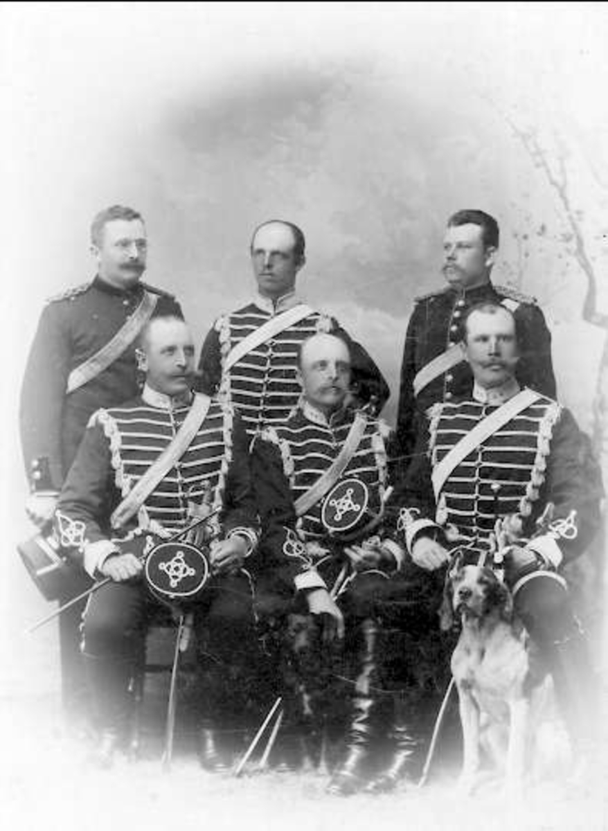 Från vänster: Bat läkare Gustaf Ekelund (troligen), ryttm Fritz von Essen, löjtn Gustaf von Essen, ryttm Carl Axel Lewenhaupt, bat vetr Thure von Zweigbergk (troligen), löjtn Bernhard Grill.