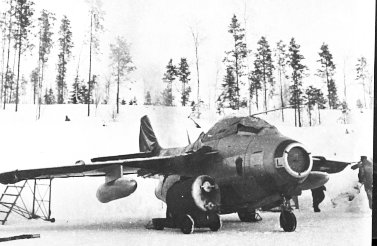 F6 Karlsborg 1957. Vinterövning i Norrland. Uppvärmning av motor och klargöring i värn på flygplan A 29 "Tunnan". Extra bränsletankar under vingen.