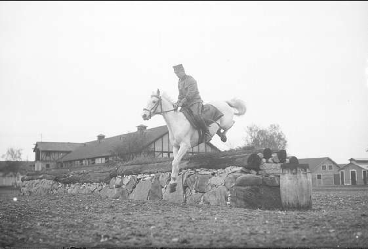Träningshoppning på stenmuren på östra kaserngården. Furir i uniform m/10 och mössa m/1895.