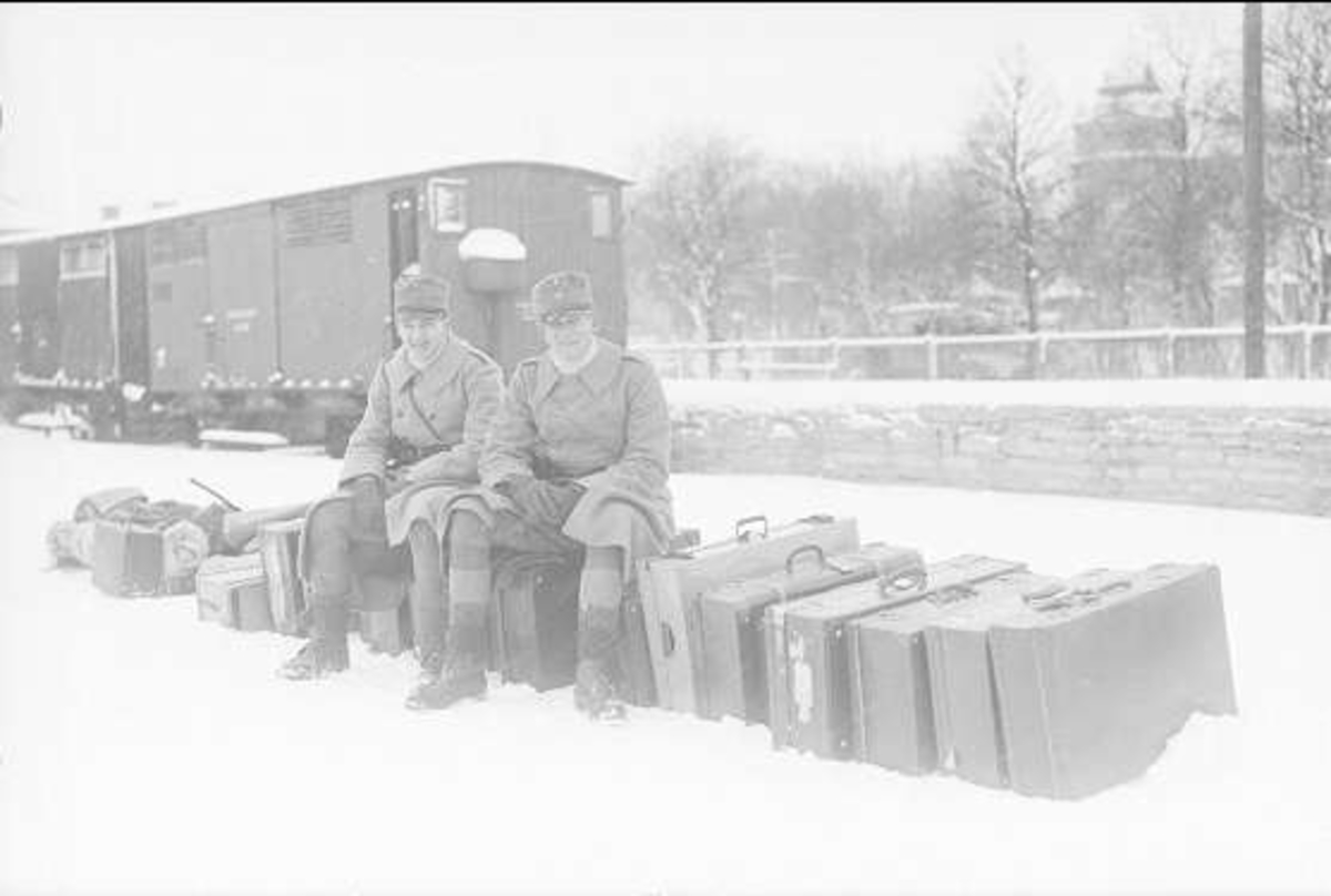 På väg mot fälttjänstövning. Två glada livhusarer vaktar befälets bagage i väntan på lastning, hotell Billingen i bakgrunden.