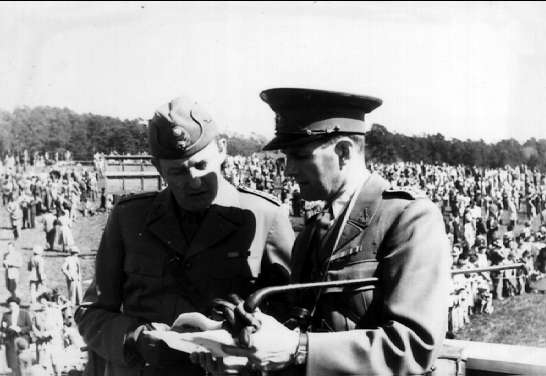 Ryttmästarna Gunnar ("Putte") Schildt och Folke ("Lotta") Linton. Diskussion om vem som vinner i dag.