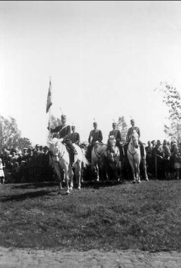 Standar och standarvakt beridna på enbart vita hästar i samband med avtäckande av livskvadronens minnessten vid Fellingsbro, 6 juni 1948. Deputationer från grenadjärerna och husarerna deltog, Fellingsbros manskör sjöng och stor var uppslutningen av traktens befolkning.