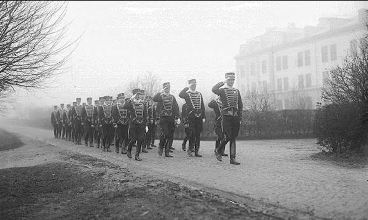 Förbimarsch söder valvet K 3 kasern efter 4. decemberhögtidlighet i soldathemmet.