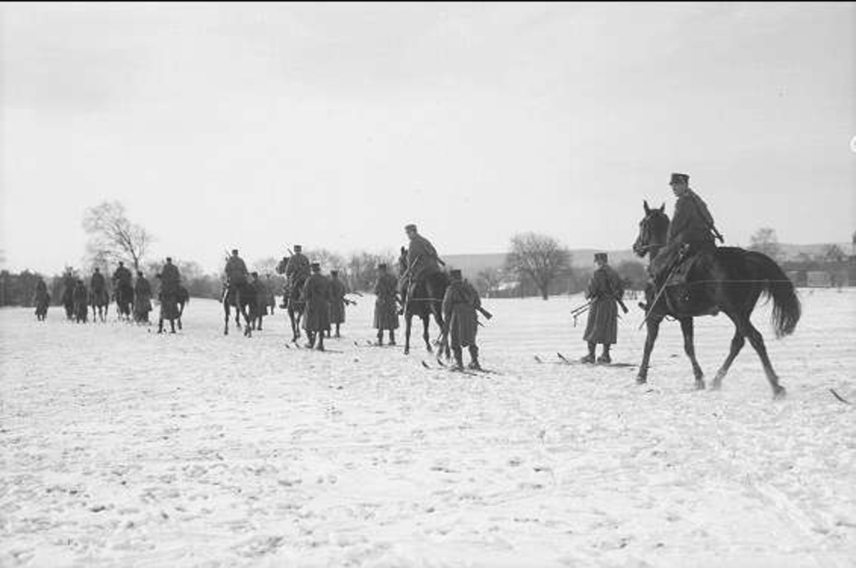 Vinterutbildning med regementets stamskolor. Främst chefen ensam efter en tolkryttare, därefter två tolkande husarer efter varje tolkryttare. Efter vissa tolkryttare pulka eller kavallerikälke (här det senare), efter denna en man för styrning och bromsning.