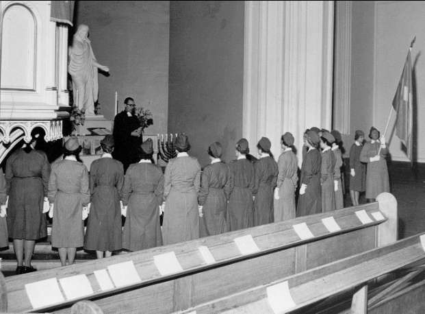Karlsborg, armelottakårens 25-års jubileum i Garnisonskyrkan år 1959. Fanbärare Astrid Ragnar. Freijds foto.