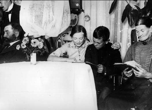 Forsvik, fotot taget år 1912 - 13 i lotsbostaden i "gamla slussbyggnaden", som flyttades år 1916. Från vänster lotsen Alexander Ericsson (sittande), sonen Carl Ericsson (stående bakom), dottern Anna Ericsson, sonen Knut Ericsson och lotshustrun Augusta Pehrsdotter.