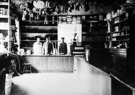 Interiörbild från Forsviks brukshandel år 1917. Personer från vänster: Viola Holm (affärsbiträde), August Ohlsson (föreståndare) och Ernst Andersson ("Bod-Knodd").