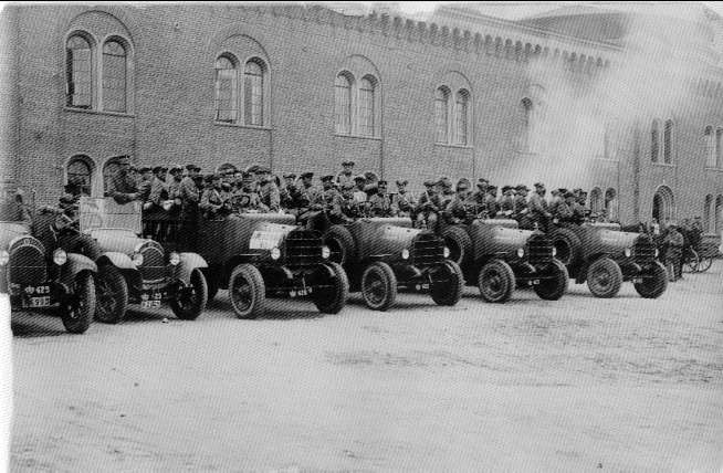 Int 2, militära fordon från år 1929. I bil nr 3 från vänster, längst fram sitter Karl Ivar Kvist.