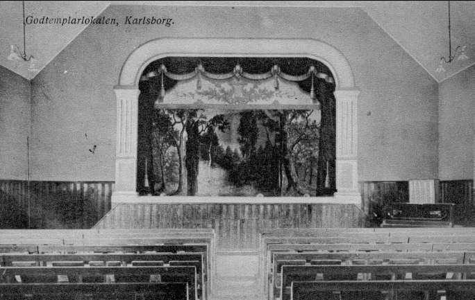 Karlsborg, interiör av teaterbio. Byggnaden revs sommaren 1998, låg där parkeringen till ICA Supermarket nu är. Kortet finns ej på museet.