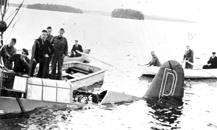 F6 Karlsborg 1945. Den 3/7 nödlandade B17 Röd David i Vättern pga. motorstörningar efter start. Föraren och signalisten klarade sig utan skador. Flottiljens räddningsbåt bogserade planet ca 20 minuter mär det sjönk på 20 meters djup. Bärgades senare till stenbryggan och hissades upp med bryggans lyftkran. Åskådare i båten till höger är från vänster Dahlström, Lundqvist och Lööv. I bakgrunden syns Lindön och Pukön. Albumet är en del av en donation från Karl-Axel Hansson, Karlsborg. Förteckning över hela donationen finns i albumet samt som Word-dokument.