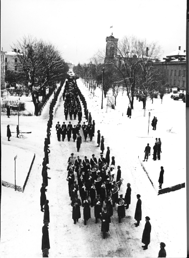 F6 Karlsborg 1947. Procession från Garnisonskyrkan till järnvägsstationen med de 5 ur F6 personal som omkom i en flygolycka i Salerno. I järnvägsvagnar transporterades sedan löjtnanterna Wånge och Pehrson samt flygplansmästaren Holm till sina respektive hemorter för gravsättning. Processionen fortsatte sedan till Karlsborgs södra kyrkogård där flygteknikerna Ågren och Thelner gravsattes. Albumet är en del av en donation från Karl-Axel Hansson, Karlsborg. Förteckning över hela donationen finns i albumet samt som Word-dokument.
