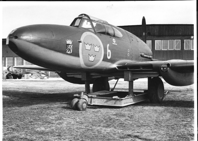 F6 Karlsborg 1948. Transportvagn för buklandade A21:or, tillverkad på flottiljens flygverkstad. Huvud- och sporrhjul från flygplan B5. Albumet är en del av en donation från Karl-Axel Hansson, Karlsborg. Förteckning över hela donationen finns i albumet samt som Word-dokument.