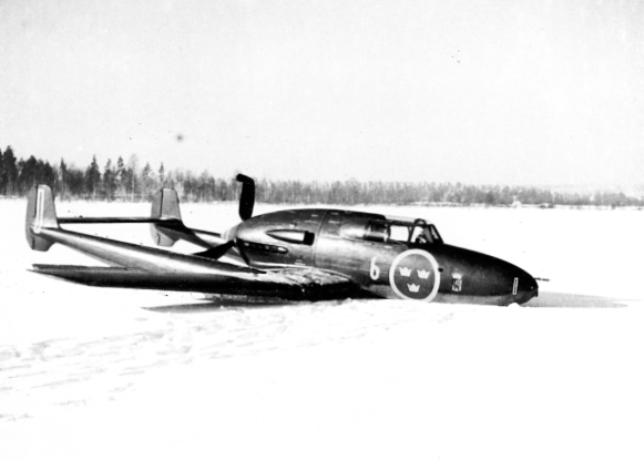 F6 Karlsborg 1951. Löjtnant Brostrand nödlandar med A21 blå Ivar på bottensjöns is pga. att motorn skurit (oljeläckage). Albumet är en del av en donation från Karl-Axel Hansson, Karlsborg. Förteckning över hela donationen finns i albumet samt som Word-dokument.