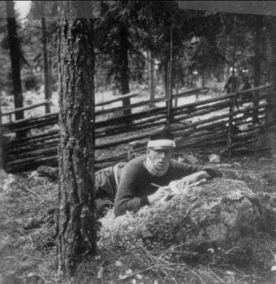 Samövningar med F 1 i Västerås och arméfälttjänstövningar i Gästrikland sept-okt 1936. För den enskilde soldaten har koktrossen och dess verksamhet stor betydelse. Mästerkocken "Pelle" vpl Pettersson (i det civila bergsprängare i Närke) skriver brev till sin hustru. Fotot är en gåva av Tage Södergren.