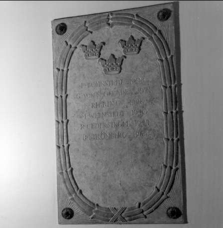 Minnestavla i sten över i tjänst avlidna. Text: F Bohnstedt 1908, G von Segebaden 1921, F Ribbing 1928, M Wernstedt 1940, R Cederström 1944, B Strömberg 1964.